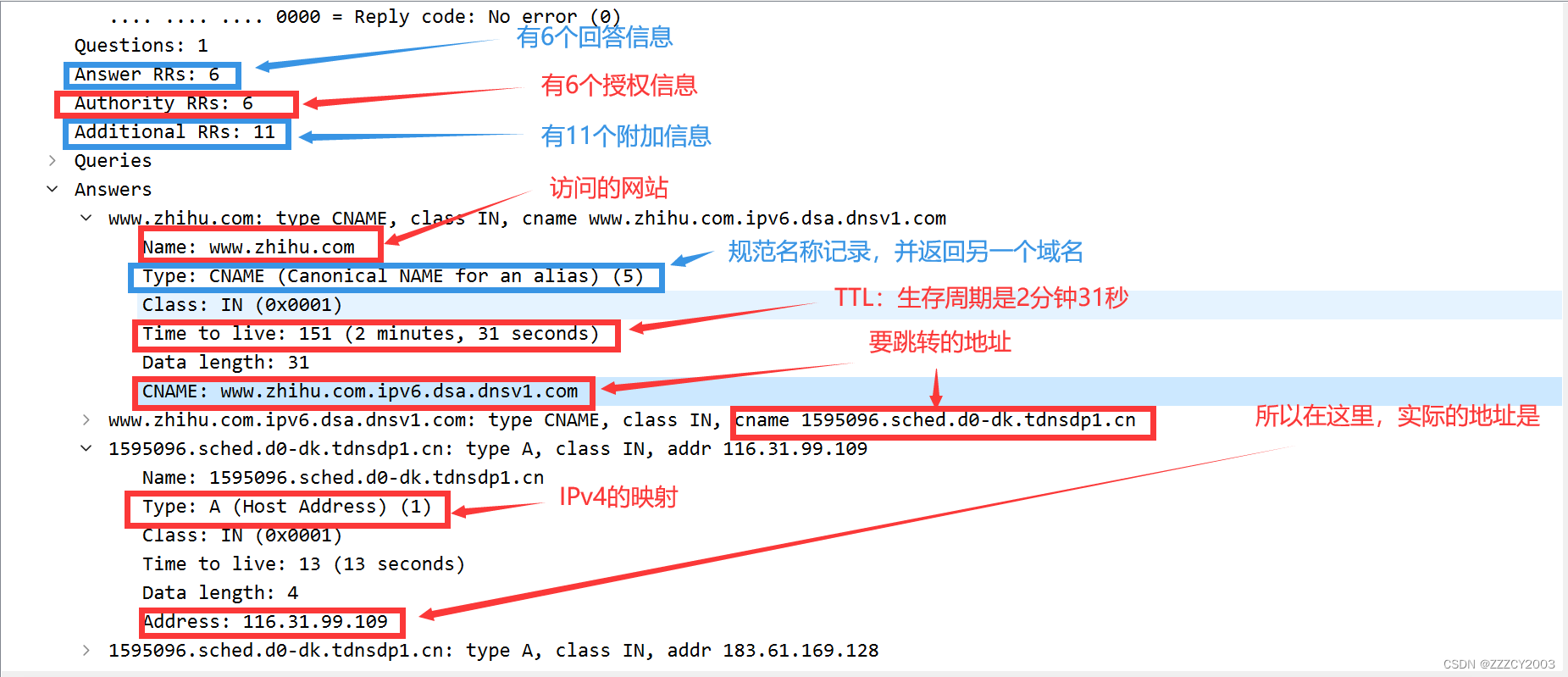 正文包括 Queries(查询问题区域)、Answers(回答区域)、Authoritative nameservers(授权区域)和 Additional records(附加区域)。