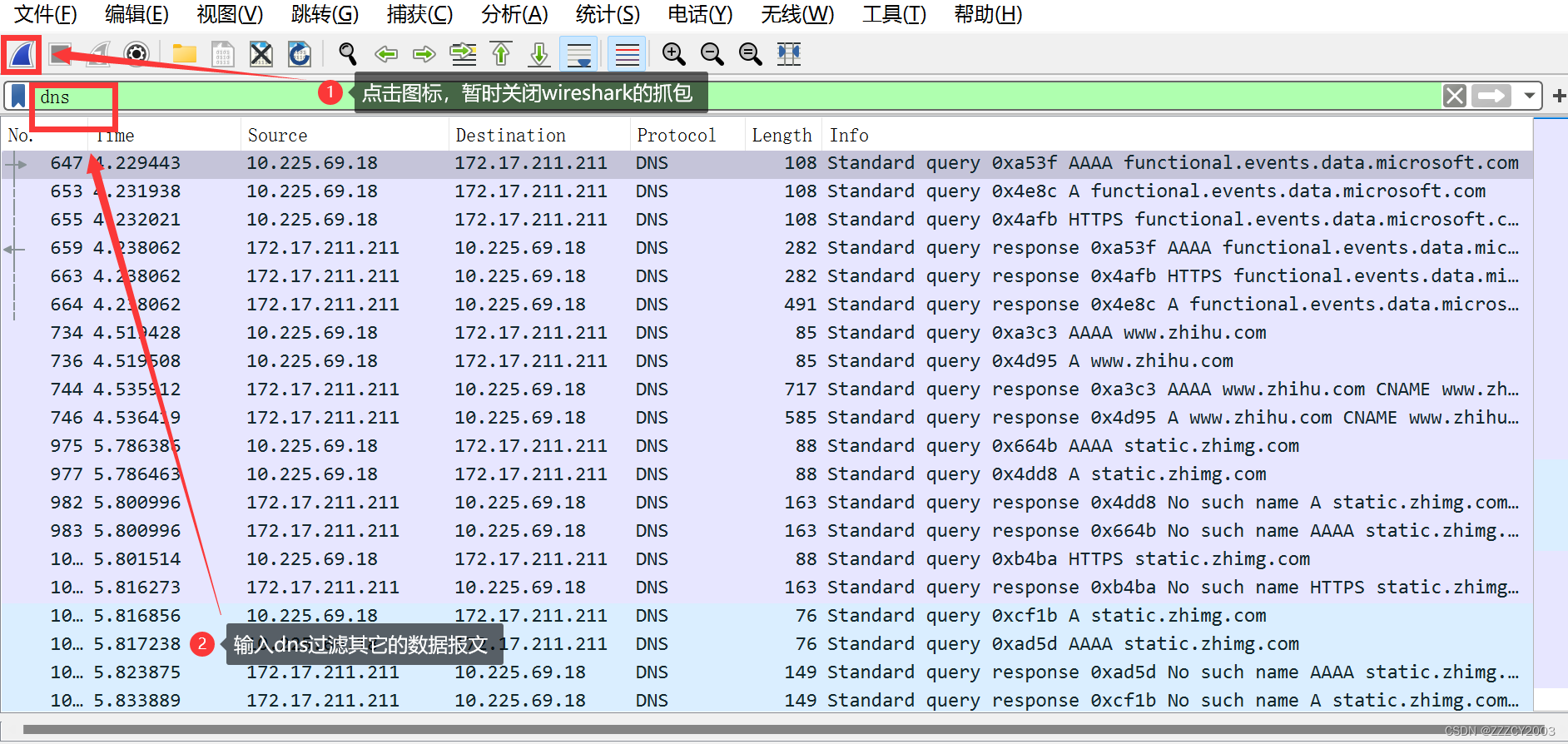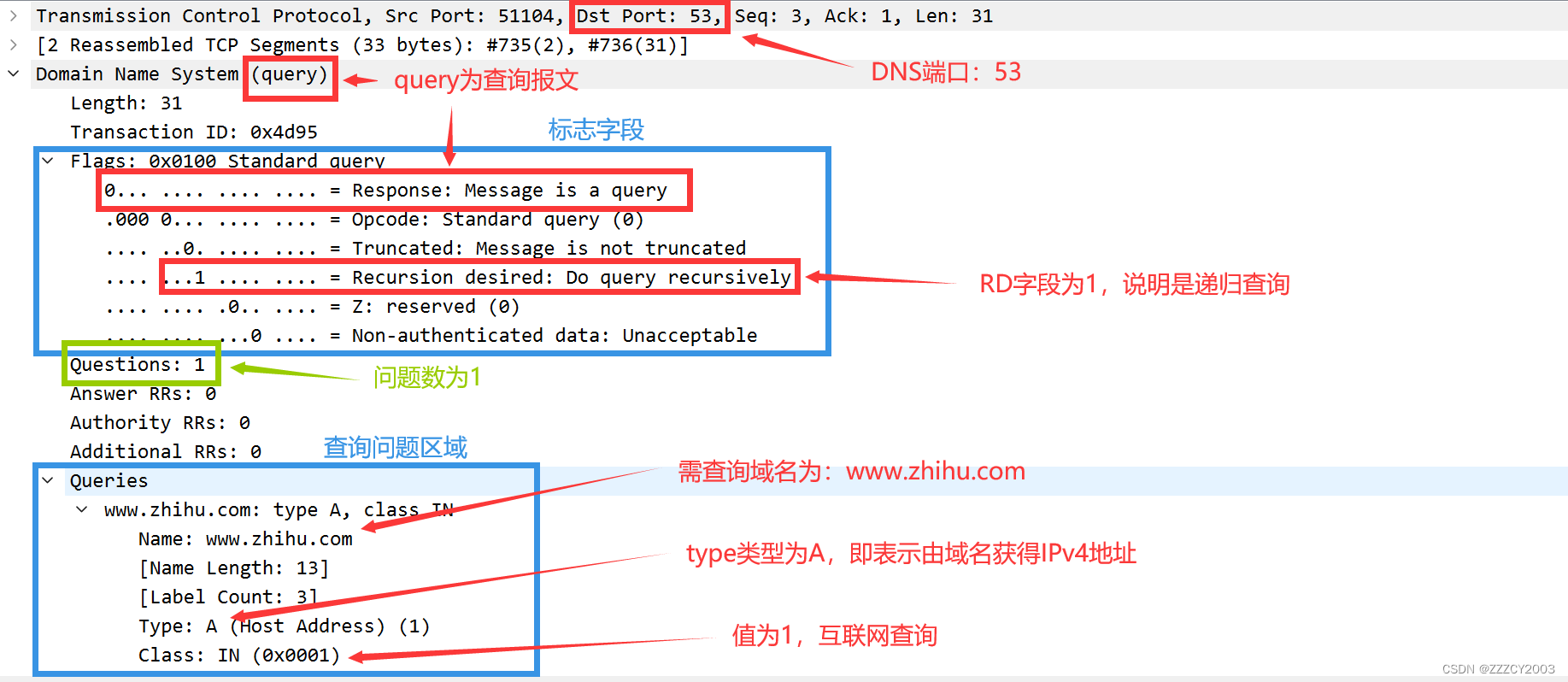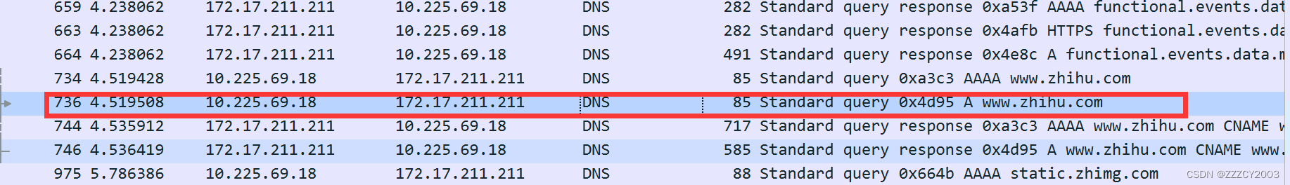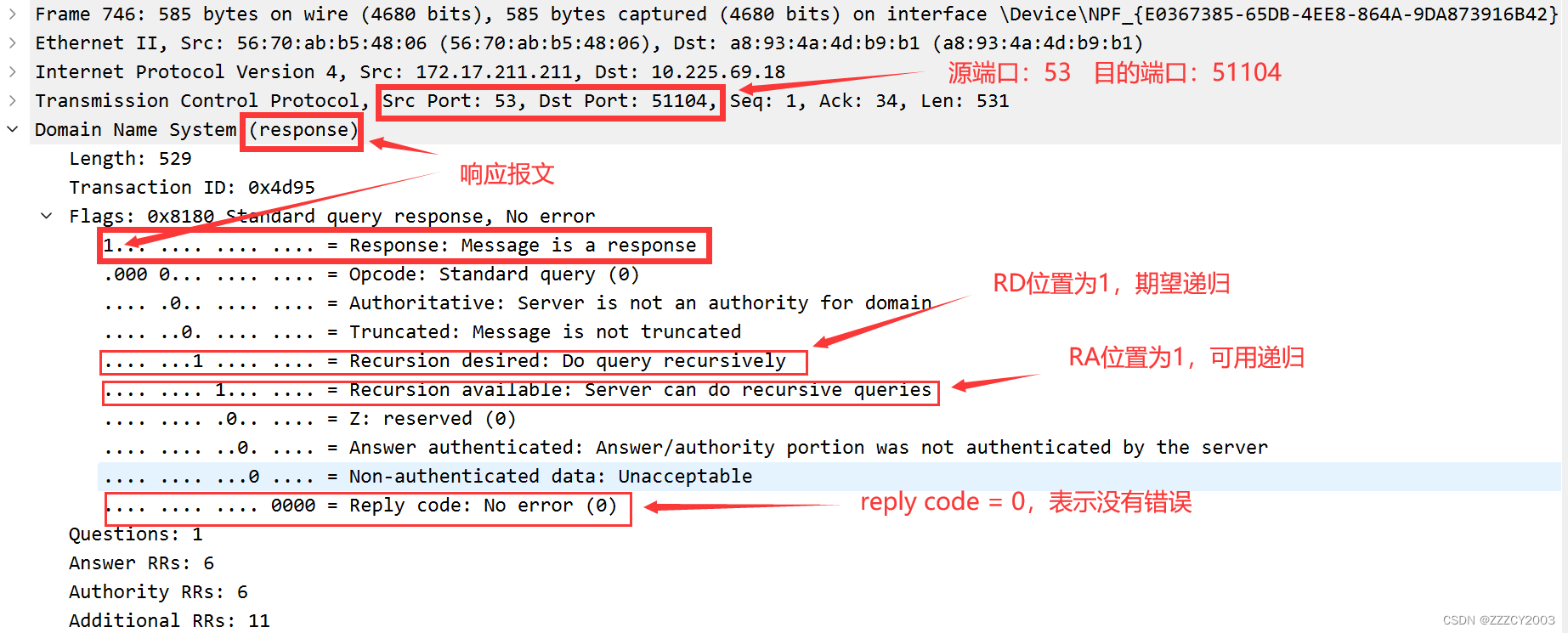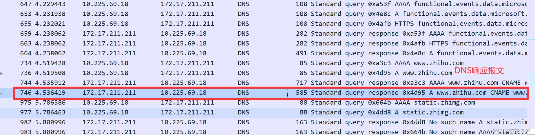 这次的源端口变成了53,这是因为这是响应报文,由DNS服务器发出的响应。而目的端口就是我们自己。