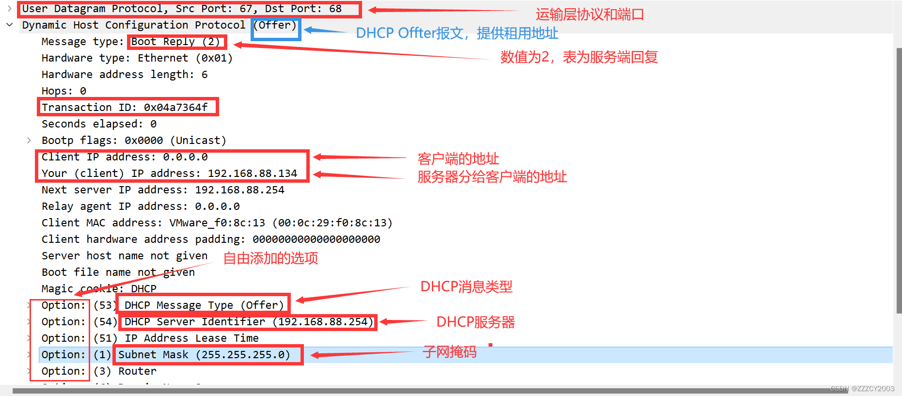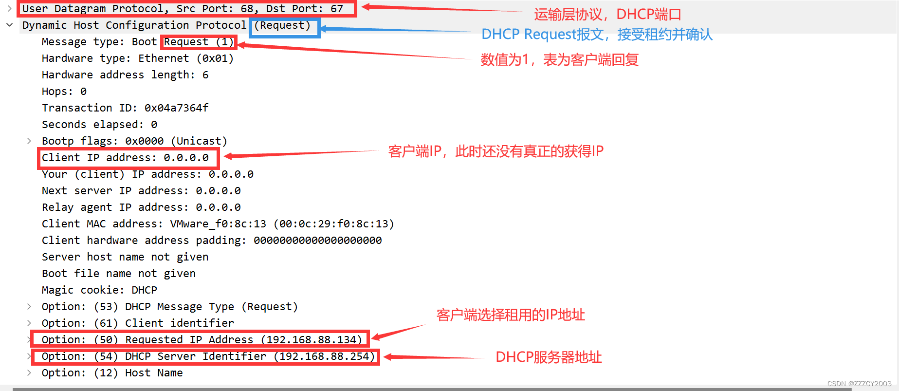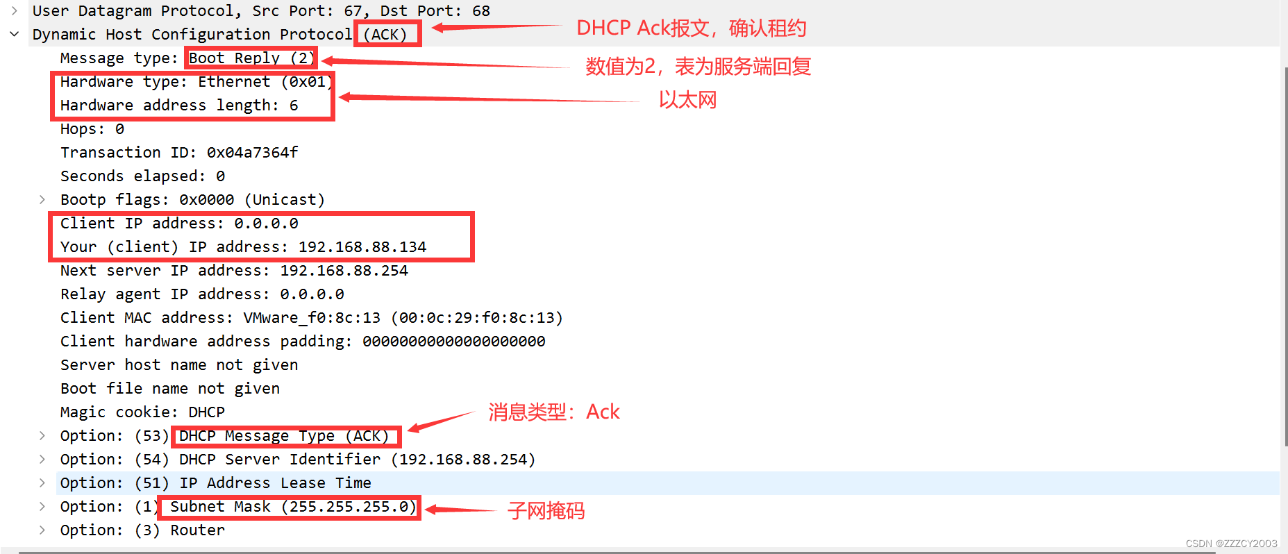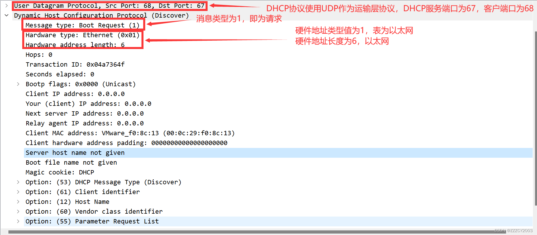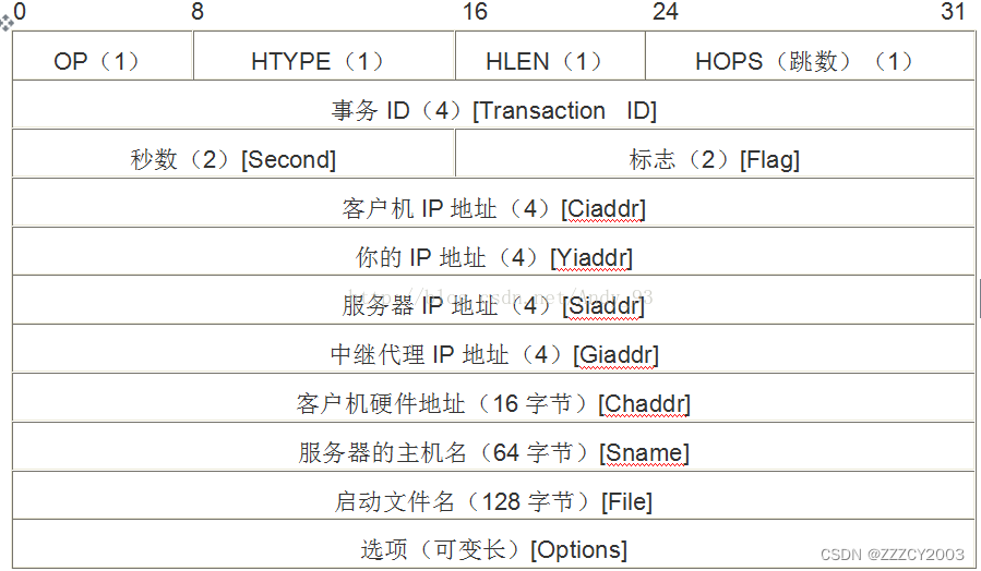 DHCP报文格式中的每个字段都有其特定的含义,以下是这些字段的详细解释: