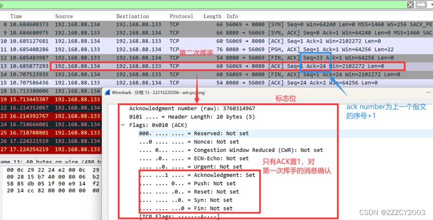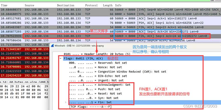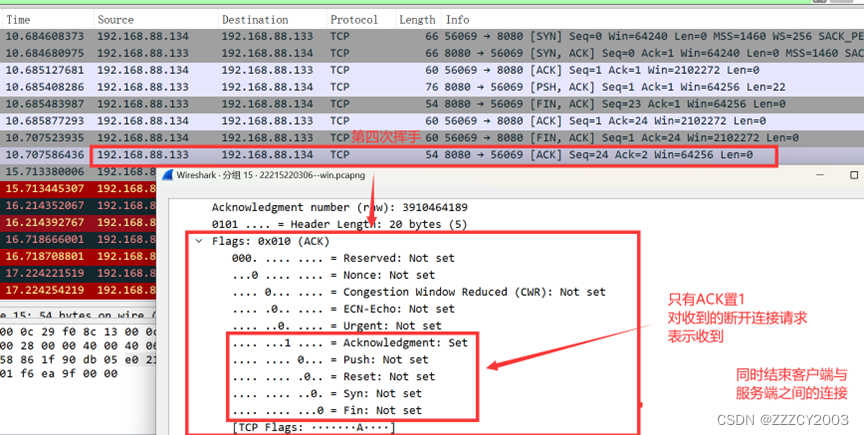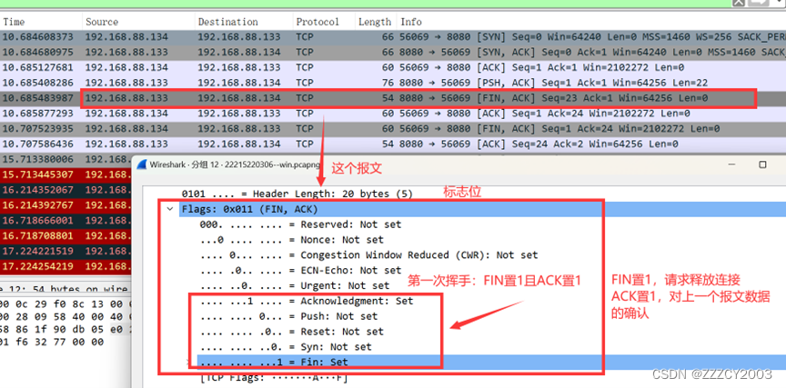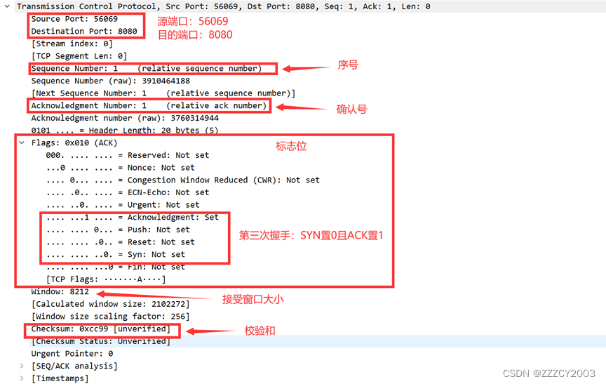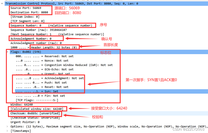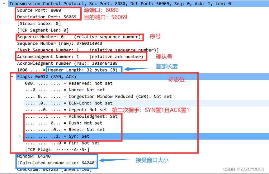 最开始的时候客户端和服务器都是处于CLOSED关闭状态。主动打开连接的为客户端,被动打开连接的是服务器。(所以源端口是我们的客户端:56069,目的端口是服务端:8080)