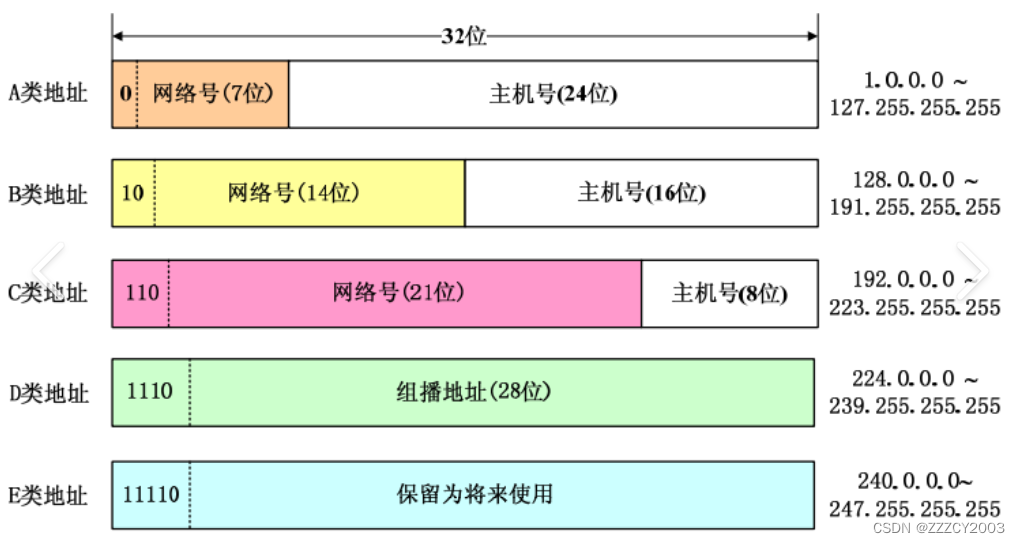 ***注:*D、E类网络都不会用来分配给主机或路由器。