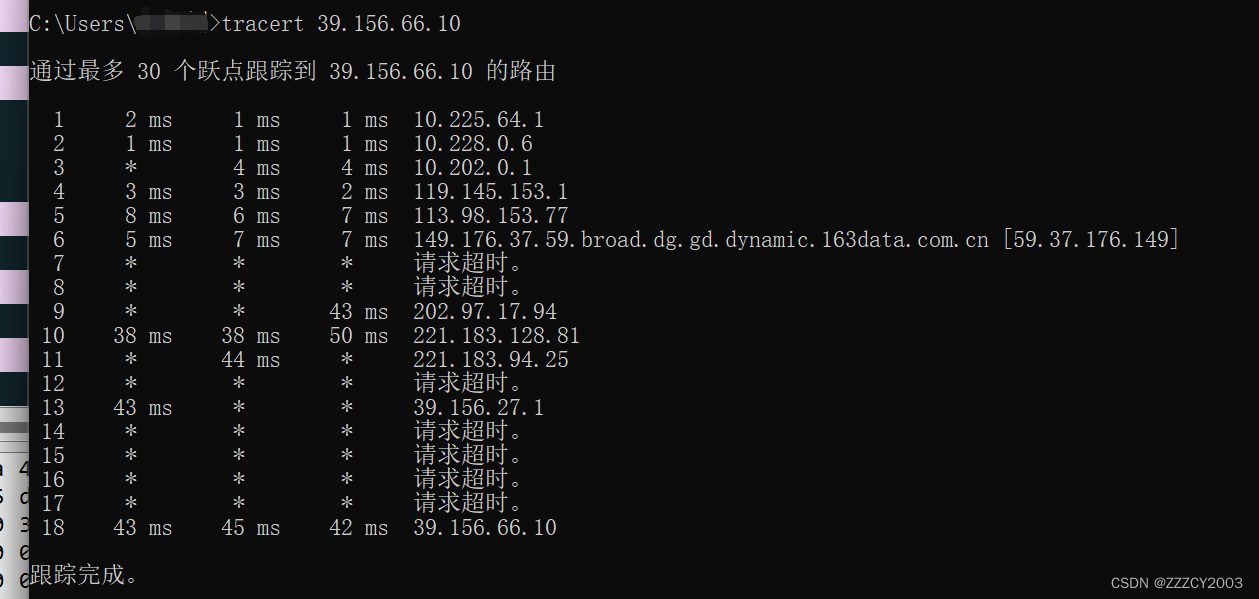 与ping步骤操作相同,将ping baidu.com 改为tracert 39.156.66.10(这个ip地址为ping百度时的百度地址)