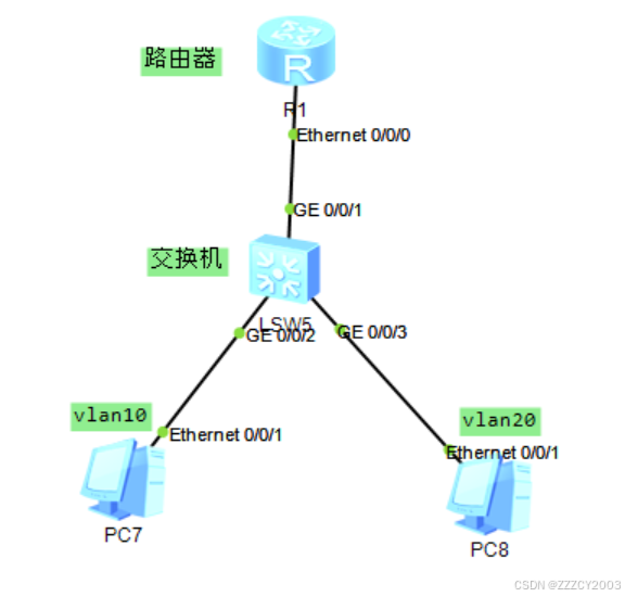 展开代码//使路由器的一个接口划分为多个子接口 //.10子接口 int g0/0/0.10 //将此接口关联vlan 10网络 dot1q termination vid 10 //.20子接口 int g0/0/0.20 //将此接口关联vlan 20网络 dot1q termination vid 20