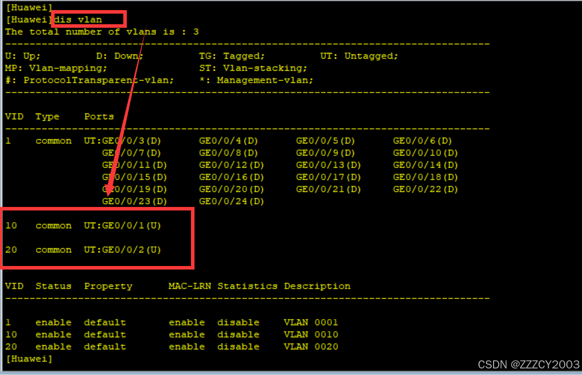 展开代码//确定接口 int g0/0/3 //设置接口类型 port link-type trunk //设置trunk接口通过vlan的类型 port trunk allow-pass vlan 10 20