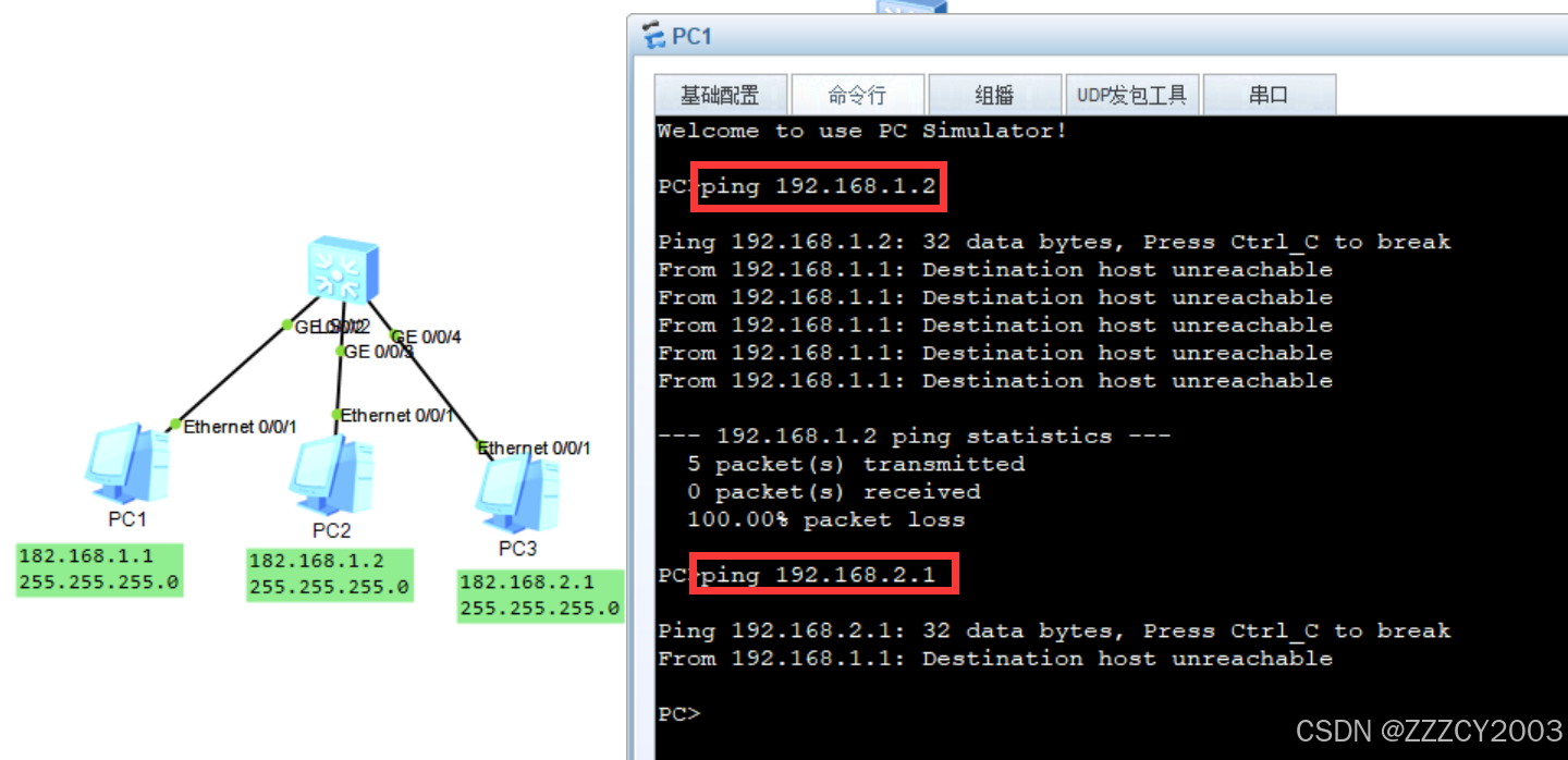 在上面的拓扑图,就可以看出,PC1和PC2是同一个网络,而PC3却是另一个网段。所以在这个简单的网络拓扑图中,PC1可以访问PC2,却访问不了PC3,如下图的PC1命令行访问结果: