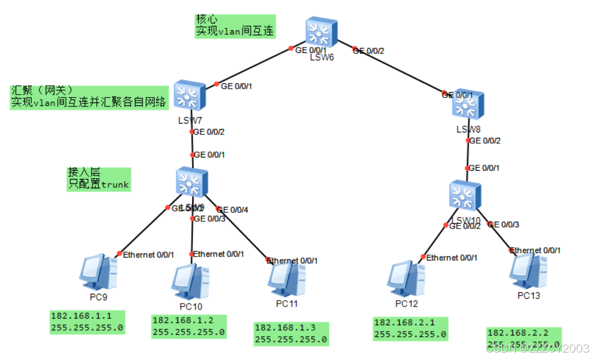 其实,trunk链路配置跟access的配置、命令是大致相同的。只是为了更好的区分access和trunk之间的区别,所以这里再强调一遍:access是只允许一个vlan的流量;而trunk则是允许多个vlan流量通过。
