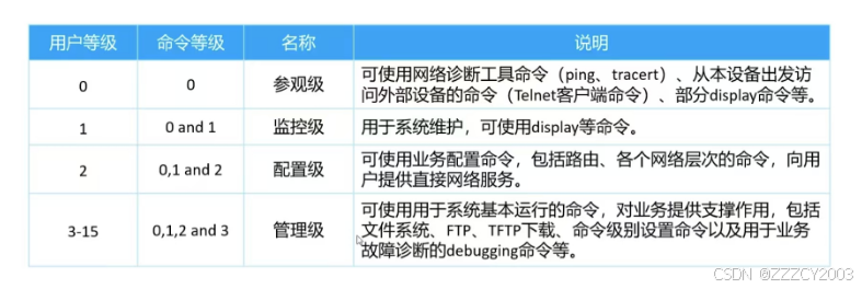 | 配置命令行等级 | user privilege level |