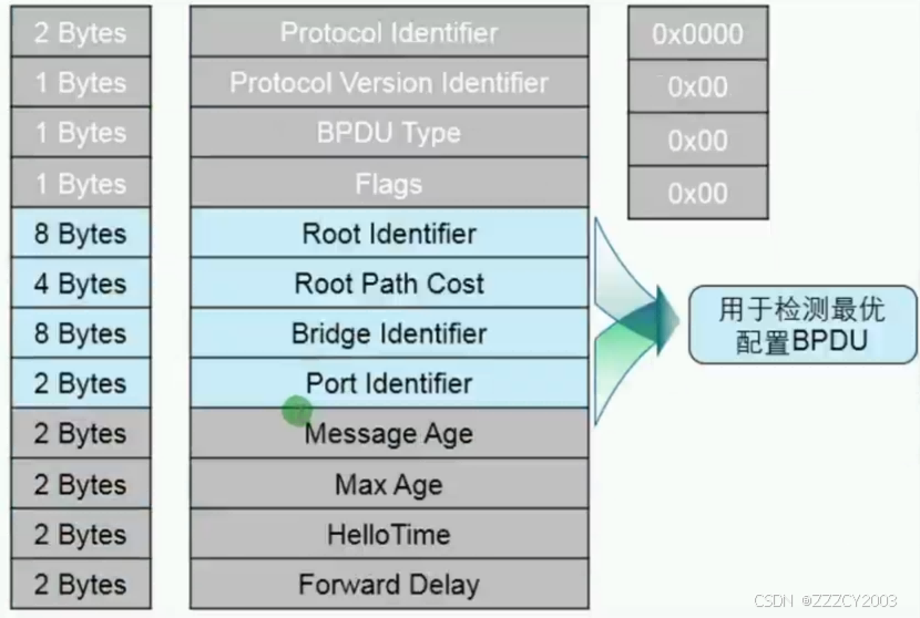 - BPDU报文头:随后是BPDU报文头,包含了STP协议的各种信息和参数。
