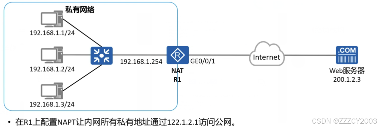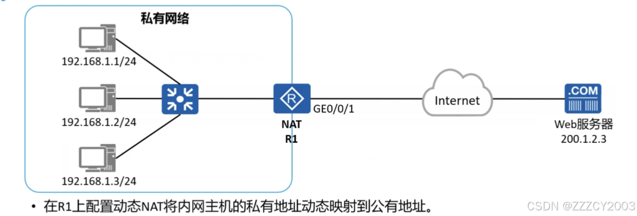 展开代码[R1]nat address group 1 122.1.2.1 122.1.2.3 [R1]acl 2000 [R1-acl-basic 2000]rule 5 permit source 192.168.1.0 0.0.0.255 [R1-acl-basic 2000]quit [R1]interface GigabitEthernet0/0/1 [R1-GigabitEthernetO/0/1]nat outbound 2000 address-group 1 no-pat