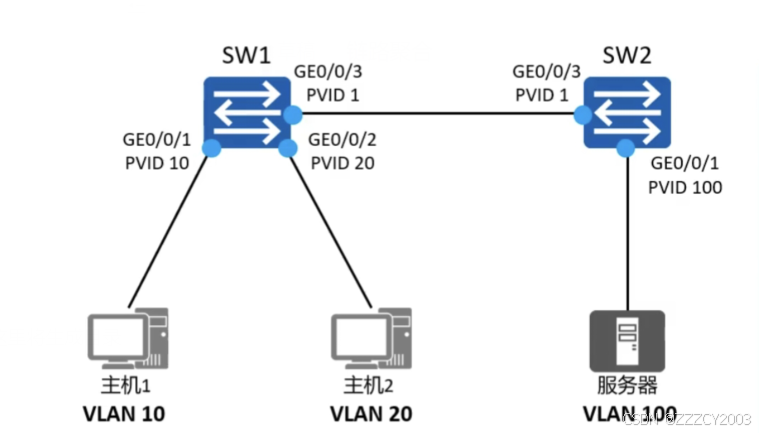 展开代码[SW1]vlan batch 10 20 100 Info: This operation may take a few seconds. Please wait for a moment...done. [SW1]interface GigabitEthernet 0/0/1 [SW1-GigabitEthernet0/0/1]port link-type hybrid [SW1-GigabitEthernet0/0/1]port hybrid pvid vlan 10 [SW1-GigabitEthernet0/0/1]port hybrid untagged vlan 10 100 [SW1-GigabitEthernet0/0/1]q [SW1]interface GigabitEthernet 0/0/2 [SW1-GigabitEthernet0/0/2]port link-type hybrid [SW1-GigabitEthernet0/0/2]port hybrid pvid vlan 20 [SW1-GigabitEthernet0/0/2]port hybrid untagged vlan 20 100 [SW1-GigabitEthernet0/0/2]q [SW1]interface GigabitEthernet 0/0/3 [SW1-GigabitEthernet0/0/3]port link-type hybrid [SW1-GigabitEthernet0/0/3]port hybrid tagged vlan 10 20 100 [SW1-GigabitEthernet0/0/3]q