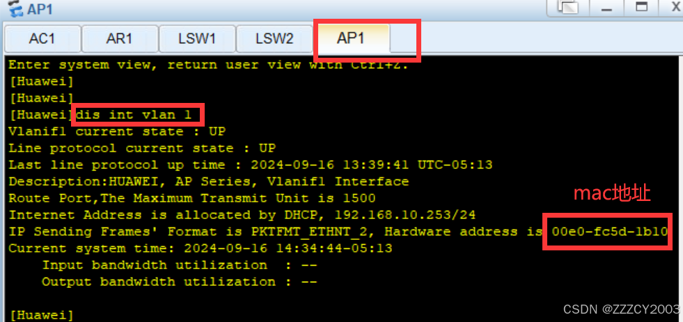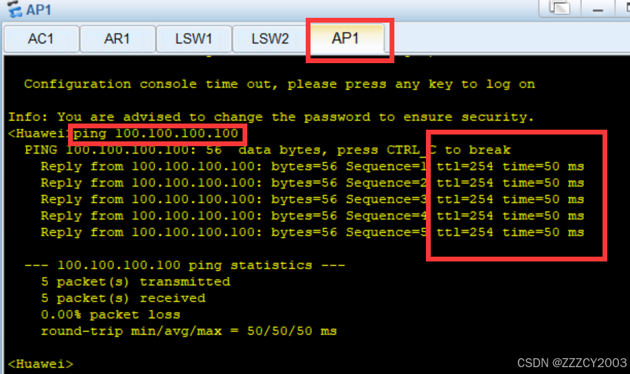 命令敲到这里AP就可以ping通AC(100.100.100.100)