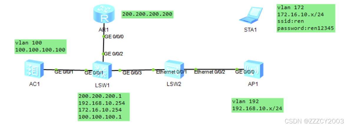- 核心交换机、路由器的IP地址和基本配置已完成,需要完成WLAN配置,实现STA接入网络,可以ping通路由器