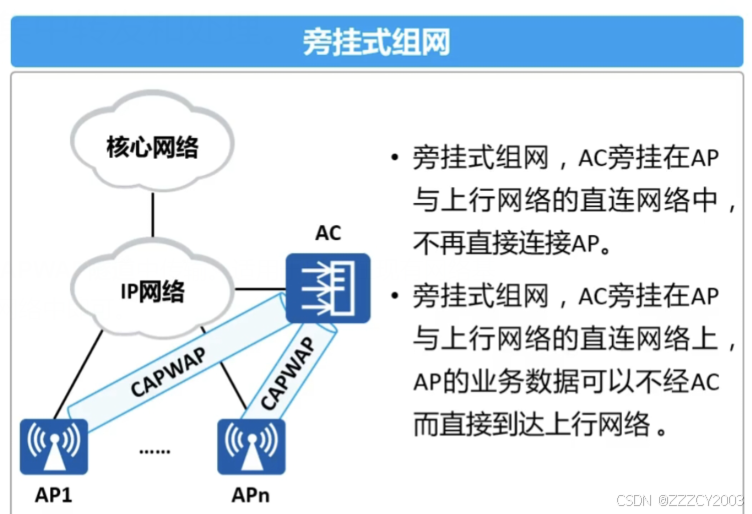AC只承载对AP的管理功能,管理流封装在CAPWAP隧道中传输。适用于后期在现有网络基础上扩展无线网络的场景,只需将AC旁挂在现有网络中即可。
