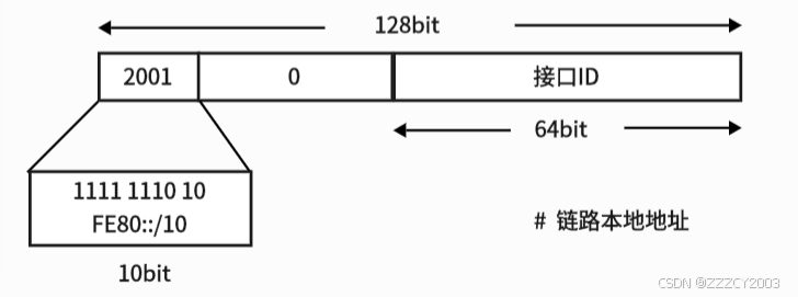 - 单个支持IPv6的接口至少含有一个环回地址(::1/128)和一个本地链路地址