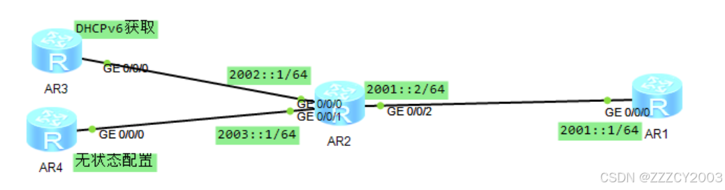 展开代码# AR1配置 [AR1]interface GigabitEthernet 0/0/0 [AR1-GigabitEthernet0/0/0]ipv6 address 2001::1 64 [AR1-GigabitEthernet0/0/0]q # AR2配置 [AR2]interface GigabitEthernet 0/0/0 [AR2-GigabitEthernet0/0/0]ipv6 address 2002::1 64 [AR2-GigabitEthernet0/0/0]q [AR2]interface GigabitEthernet 0/0/1 [AR2-GigabitEthernet0/0/1]ipv6 address 2003::2 64 [AR2-GigabitEthernet0/0/1]q [AR2]interface GigabitEthernet 0/0/2 [AR2-GigabitEthernet0/0/2]ipv6 address 2001::2 64 [AR2-GigabitEthernet0/0/2]q