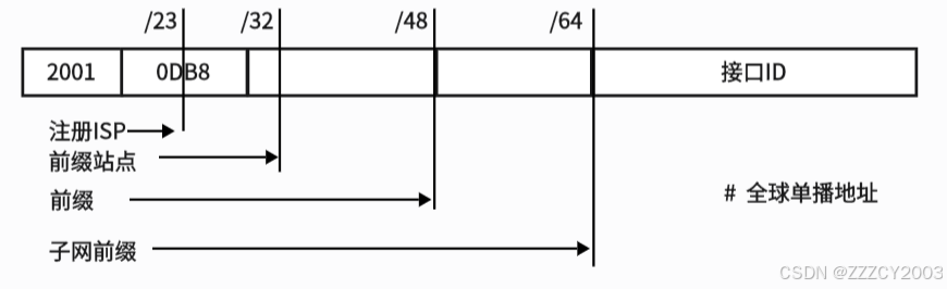 - 使用全球路由前缀,这是一种能向上聚合,最终到达ISP的结构