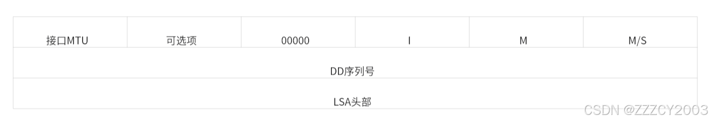 **接口MTU:**在报文不分段的情况下,路由器接口能发送的最大IP报文的大小 **I:**初始位,发送的第一一个 DD包的1位置1,后续DD包的1位置0 **M:**后继位,最后一个DD包的M位置0;其他DD包的M位置1,表示后面还有其他DD报文 **M/S:**主从位,用于协商主/从路由器,置1表示Master,置0表示Slave,路由器ID大的一方会成为Master **DD序列号:**在数据库同步过程中,用来确保路由器收到完整的DD报文。由Master规定起始序列号,每发送一个 DD报文,序列号就加1, Slave使用Master的序列号进行确认。因此,主从路由器利用序列号来保证DD报文传输的可靠性和完整性