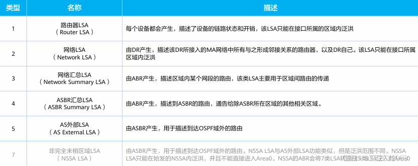 一台路由器中所有的LSA都被存放在其LSDB中,正确的LSA可以描述一个OSPF区域的网络拓扑结构。OSPF中常见的LSA有6种