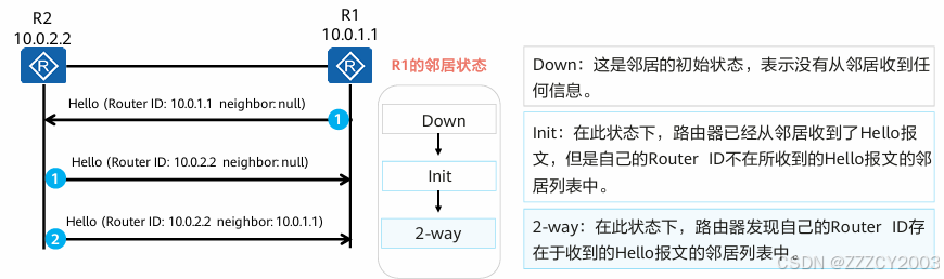 路由器要先发现邻接的路由器,才能建立邻居关系。通过周期性发送Hello包并接收来自其他路由器的Hello包,进行建立并维护邻居关系。报文内容包括一些定时器的数值、DR、BDR以及自己已知的邻居信息。