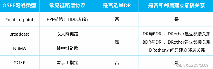 为了能够适应二层网络环境,根据路由器所连接物理网络的不同,OSPF协议通常将网络划分 为4种类型:广播多路访问(BMA)、非广播多路访问(NBMA)、点到点(P2P )、点到多点(P2MP)。在每种网络类型中,OSPF协议的运行方式都不同,包括是否需要选举DR和Hello报文的发送周期为多少等