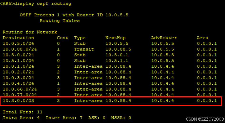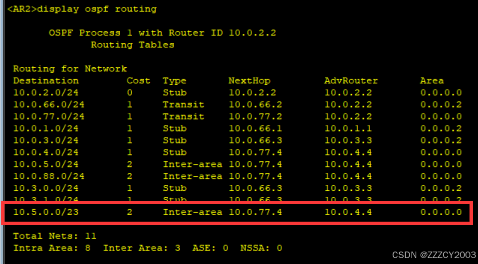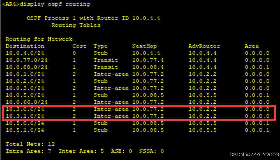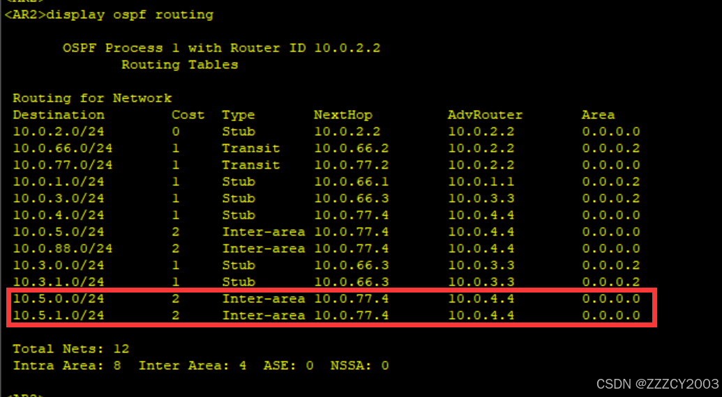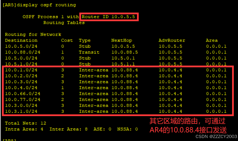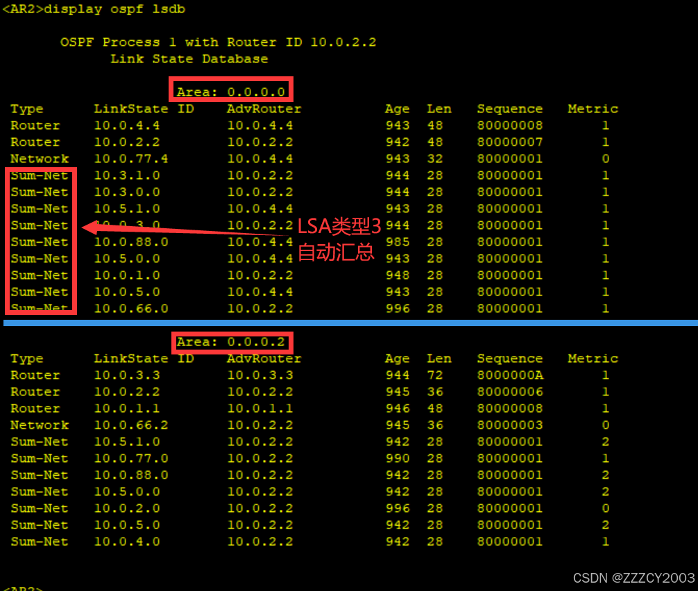 AR2路由表上的AR5路由、AR4路由表上的AR3都可以进行区域间汇总,之后在想其他区域发送。减少路由条目和路由震荡的发生