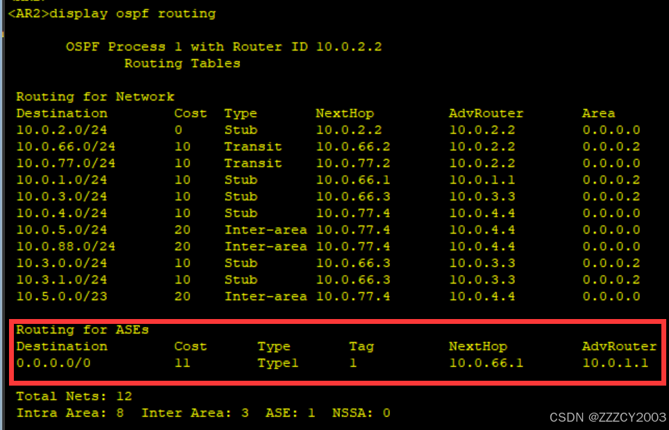 展开代码[AR2]ospf 1 [AR2-ospf-1]import-route direct [AR2-ospf-1]asbr-summary 10.2.0.0 255.255.254.0 [AR2-ospf-1]