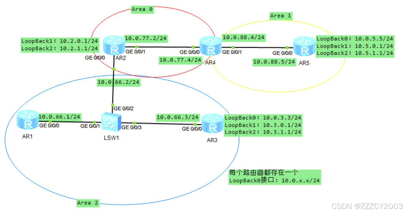 展开代码# AR1配置 [AR1]interface GigabitEthernet 0/0/0 [AR1-GigabitEthernet0/0/0]ip address 10.0.66.1 24 [AR1-GigabitEthernet0/0/0]q [AR1]interface LoopBack 0 [AR1-LoopBack0]ip address 10.0.1.1 24 [AR1-LoopBack0]q # AR2配置 [AR2]interface GigabitEthernet 0/0/0 [AR2-GigabitEthernet0/0/0]ip address 10.0.66.2 24 [AR2-GigabitEthernet0/0/0]q [AR2]interface GigabitEthernet 0/0/1 [AR2-GigabitEthernet0/0/1]ip address 10.0.77.2 24 [AR2-GigabitEthernet0/0/1]q [AR2]interface LoopBack 0 [AR2-LoopBack0]ip address 10.0.2.2 24 [AR2-LoopBack0]q [AR2]interface LoopBack 1 [AR2-LoopBack1]ip address 10.2.0.1 24 [AR2-LoopBack1]q [AR2]interface LoopBack 2 [AR2-LoopBack2]ip address 10.2.1.1 24 [AR2-LoopBack2]q [AR2] # AR3配置 [AR3]interface GigabitEthernet 0/0/0 [AR3-GigabitEthernet0/0/0]ip address 10.0.66.3 24 [AR3-GigabitEthernet0/0/0]q [AR3]interface LoopBack 0 [AR3-LoopBack0]ip address 10.0.3.3 24 [AR3-LoopBack0]q [AR3]interface LoopBack 1 [AR3-LoopBack1]ip address 10.3.0.1 24 [AR3-LoopBack1]q [AR3]interface LoopBack 2 [AR3-LoopBack2]ip address 10.3.1.1 24 [AR3-LoopBack2]q # AR4配置 [AR4]interface GigabitEthernet 0/0/0 [AR4-GigabitEthernet0/0/0]ip address 10.0.77.4 24 [AR4-GigabitEthernet0/0/0]q [AR4]interface GigabitEthernet 0/0/1 [AR4-GigabitEthernet0/0/1]ip address 10.0.88.4 24 [AR4-GigabitEthernet0/0/1]q [AR4]interface LoopBack 0 [AR4-LoopBack0]ip address 10.0.4.4 24 [AR4-LoopBack0]q # AR5配置 [AR5]interface GigabitEthernet 0/0/0 [AR5-GigabitEthernet0/0/0]ip address 10.0.88.5 24 [AR5-GigabitEthernet0/0/0]q [AR5]interface LoopBack 0 [AR5-LoopBack0]ip address 10.0.5.5 24 [AR5-LoopBack0]q [AR5]interface LoopBack 2 [AR5-LoopBack2]ip address 10.5.1.1 24 [AR5-LoopBack2]q [AR5]interface LoopBack 1 [AR5-LoopBack1]ip address 10.5.0.1 24 [AR5-LoopBack1]q