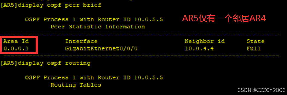 在AR5上检查邻居关系的概要信息和OSPF路由表