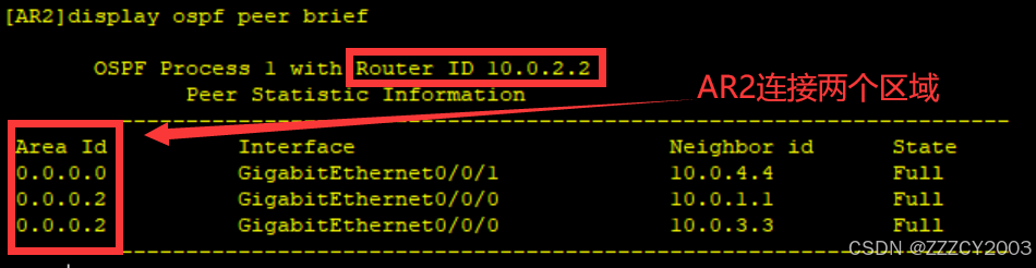 AR2作为ABR,需要维护两个区域的LSDB,分别用来描述区域0和区域2的路由