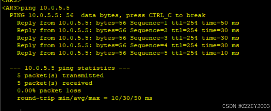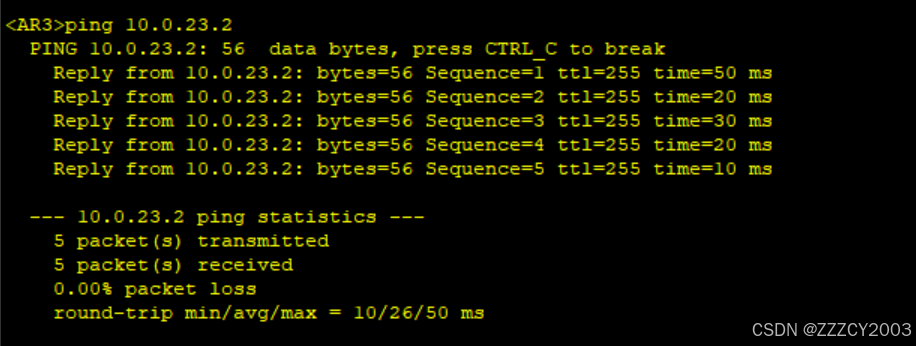 可以尝试ping通各设备,这里以AR3 ping AR2为例