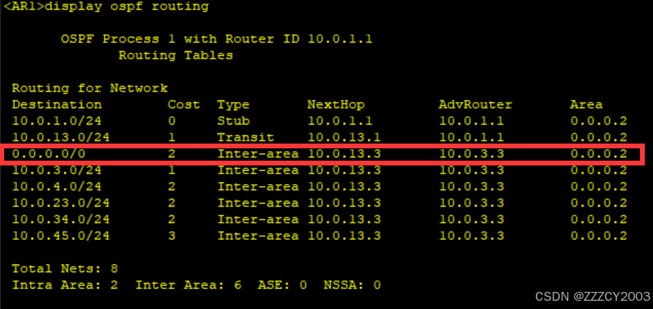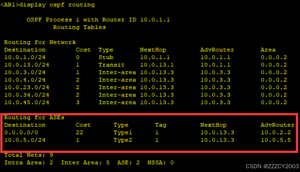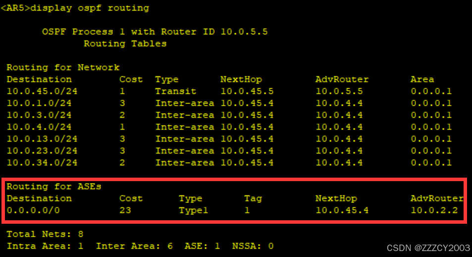 现在AR1上不存在OSPF外部路由,原本的OSPF外部路由条目0.0.0.0/0、10.0.5.0/24被一条缺省的OSPF区域间路由所取代