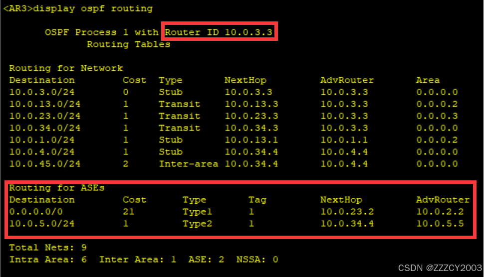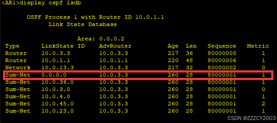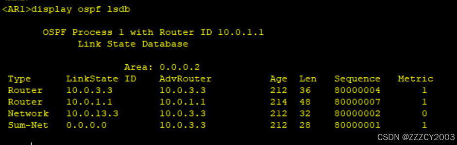 现在AR1上不存在LSA类型4、LSA类型5,去往OSPF域外通过ABR生成的LSA类型3所携带的缺省路由条目实现。同时前往其他区域的LSA类型3也存在