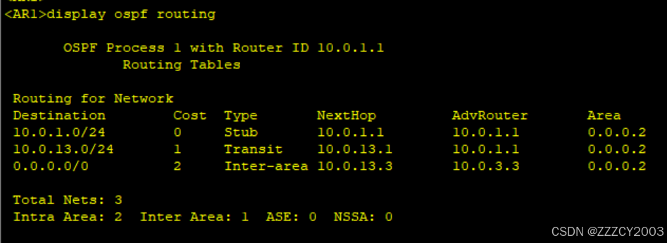 展开代码[AR3]ospf 1 [AR3-ospf-1]area 2 [AR3-ospf-1-area-0.0.0.2]stub no- [AR3-ospf-1-area-0.0.0.2]stub no-summary [AR3-ospf-1-area-0.0.0.2]q [AR3-ospf-1]q