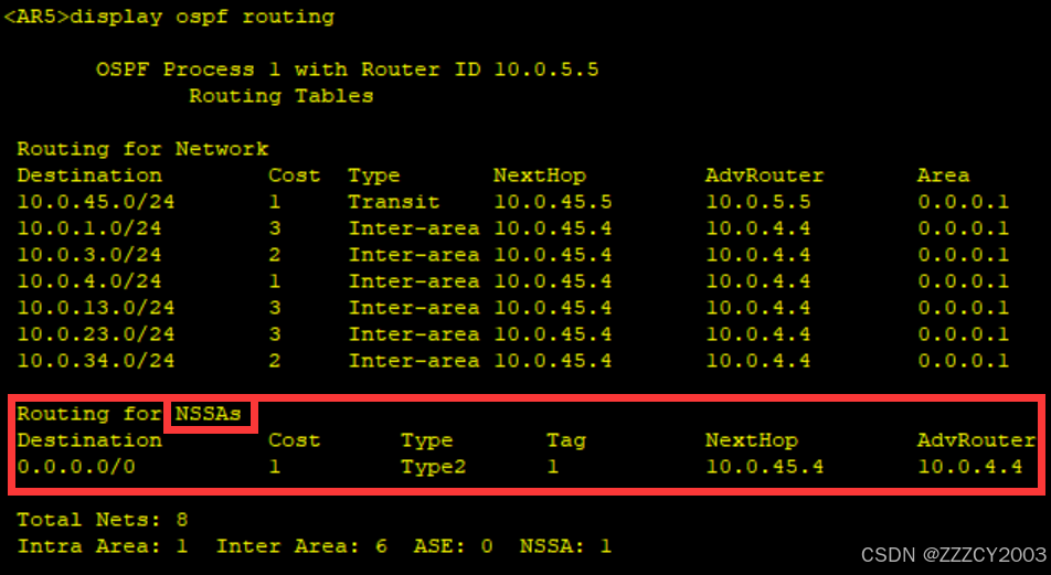 此时不存在LSA类型4、LSA类型5,外部路由以LSA类型(NSSA)的形式存在
