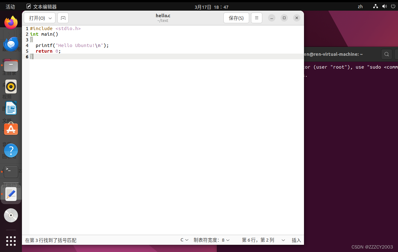 接下来,进入hello.c文件里编写代码,直接在图形界面打开hello.c文件