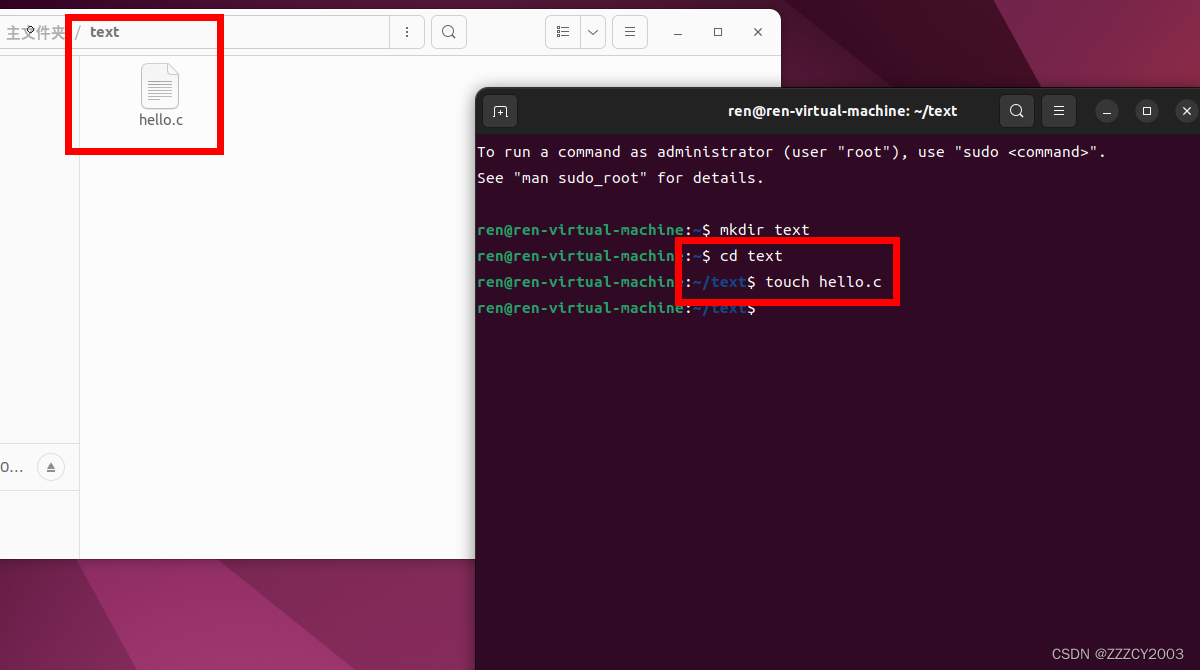 进入到text目录下,新建一个叫hello.c的C文件,可以在左边的图形界面可以看到hello.c文件存在text目录下