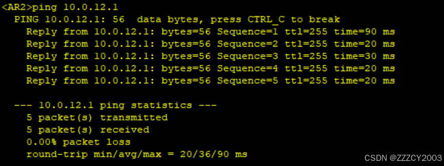 配好所有设备的IP地址,相邻设备就可以尝试ping通了,这里以AR2 ping AR1(10.0.12.1)为例