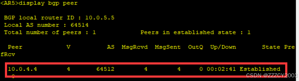 展开代码[AR4]bgp 64512 [AR4-bgp]peer 10.0.5.5 as-number 64514 [AR4-bgp]peer 10.0.5.5 ebgp-max-hop 2 [AR4-bgp]peer 10.0.5.5 connect-interface LoopBack 0 [AR4-bgp]q [AR5]bgp 64514 [AR5-bgp]router-id 10.0.5.5 [AR5-bgp]peer 10.0.4.4 as-number 64512 [AR5-bgp]peer 10.0.4.4 ebgp-max-hop 2 [AR5-bgp]peer 10.0.4.4 connect-interface LoopBack 0 [AR5-bgp]q