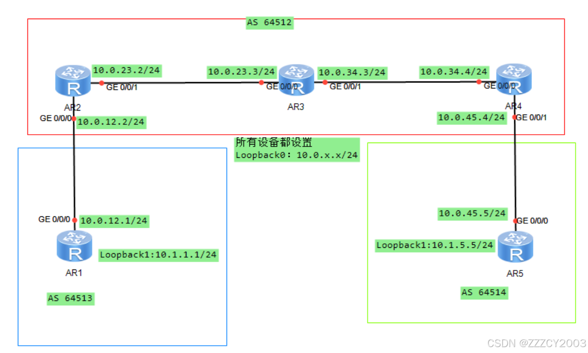所有设备皆使用Loopback0接口IP地址作为BGP Router ID。AR1、AR5上存在Loopback1模拟用户网段。AR2、AR3、AR4之间运行OSPF,在AR2、AR3、AR4的互联接口、Loopback0接口上激活OSPF