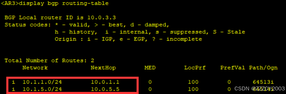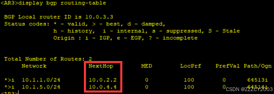 在这里AR3已经学到了AR1、AR5上发布的BGP路由,但是都是非有效路由,这是因为他们的下一跳在AR3上都不可达,所以要在AR2、AR4上通过next-hop-local命令修改下一跳地址为AR2、AR4的更新源地址