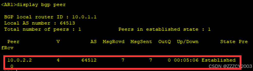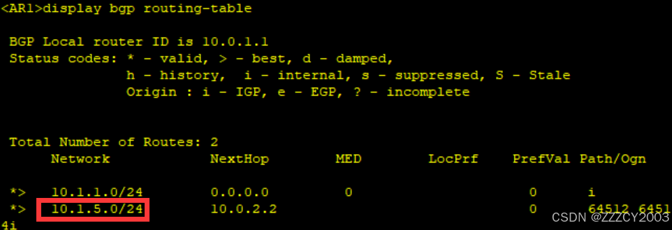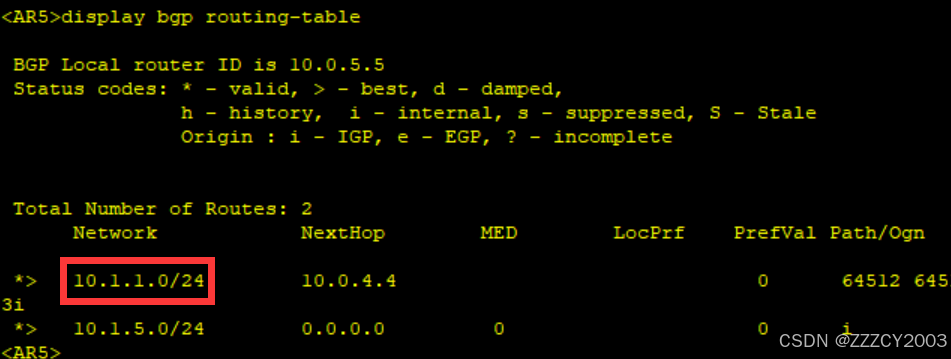 展开代码[AR1]bgp 64513 [AR1-bgp]network 10.1.1.1 24 [AR1-bgp]q [AR1] [AR5]bgp 64514 [AR5-bgp]network 10.1.5.5 24 [AR5-bgp]q [AR5]