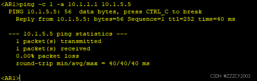 展开代码<AR1>ping -c 1 -a 10.1.1.1 10.1.5.5