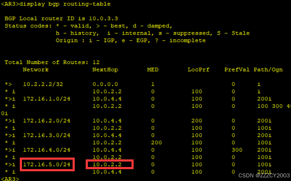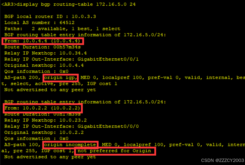 AR2通告(AR1发布)的BGP路由172.16.5.0/24,此时Origin属性值为incomplete(通过 import-route方式发布到BGP),由于Origin属性值原因,该条路由未被优选