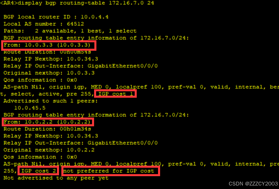 AR4优选AR3发布的BGP路由,其IGP cost为1,小于AR2发布的BGP路由IGP cost 2。 AR2发布的BGP路由未被优选的原因为IGP cost
