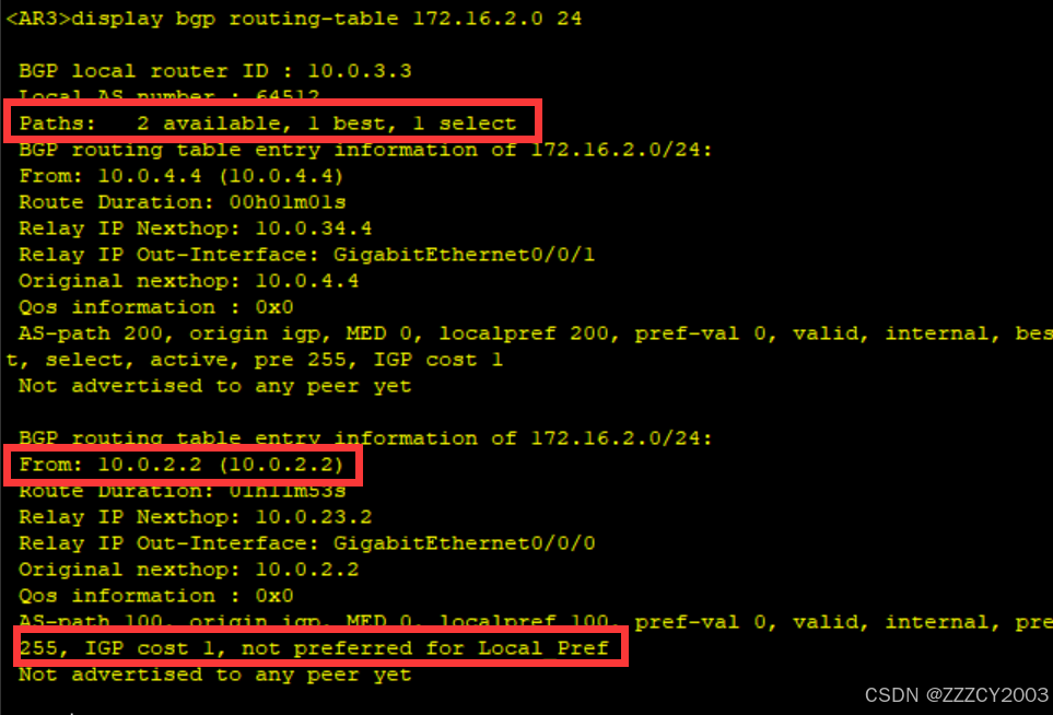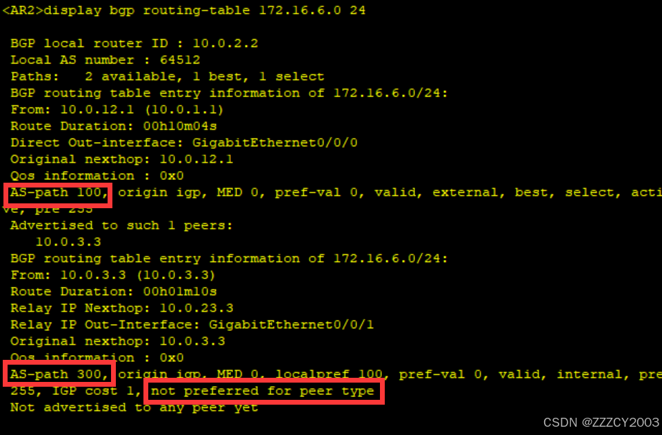 此时来自AR3的BGP路由未被优选,原因是 “ not preferred for peer type ”,在其他条件相同的情况下BGP优选来自EBGP对等体的路由