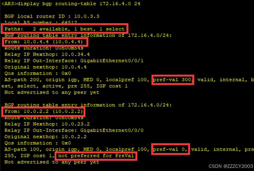 AR4通告的BGP路由172.16.4.0/24其preferred-value值为300 ,而AR2通告的preferred-value值为0,AR3优选preferred-value值较大的BGP路由,因此AR3优选AR4通告的BGP路由