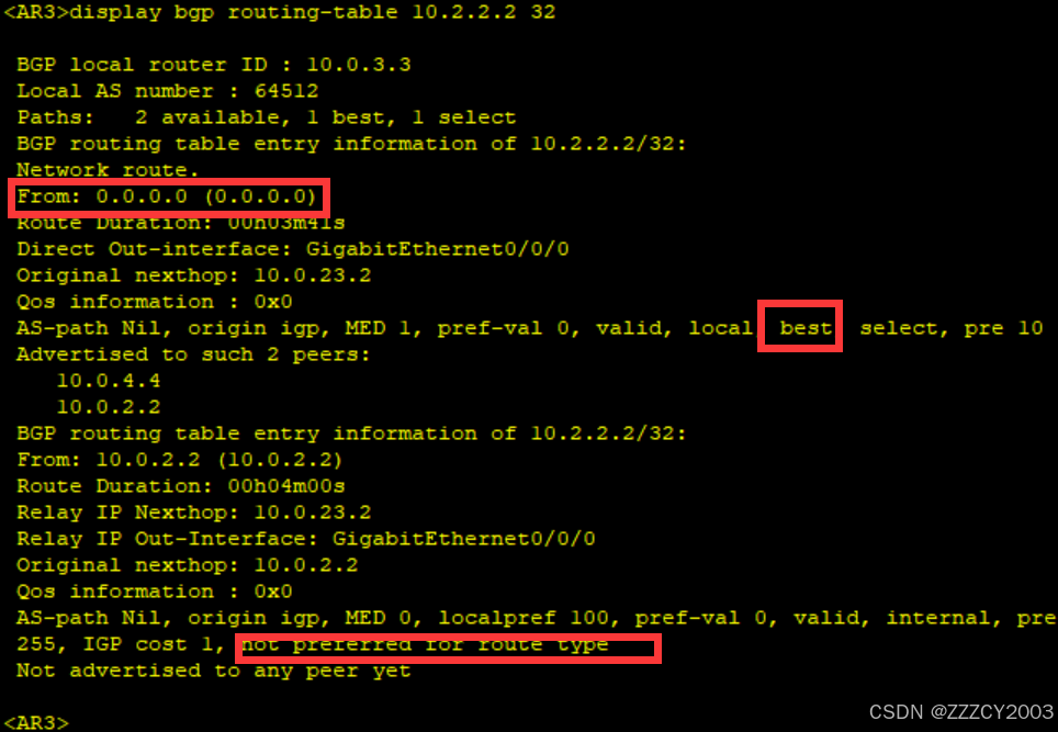 AR3上优选本地发布的BGP路由10.2.2.2/32,而AR2通告的BGP路由10.2.2.2/32未被优选的原因是 “ not preferred for route type ” ,由于路由类型原因(本地始发由于从BGP对等体学习到的)