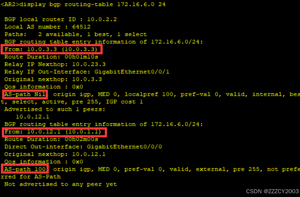 再次在AR2上查看BGP路由172.16.6.0/24的明细信息