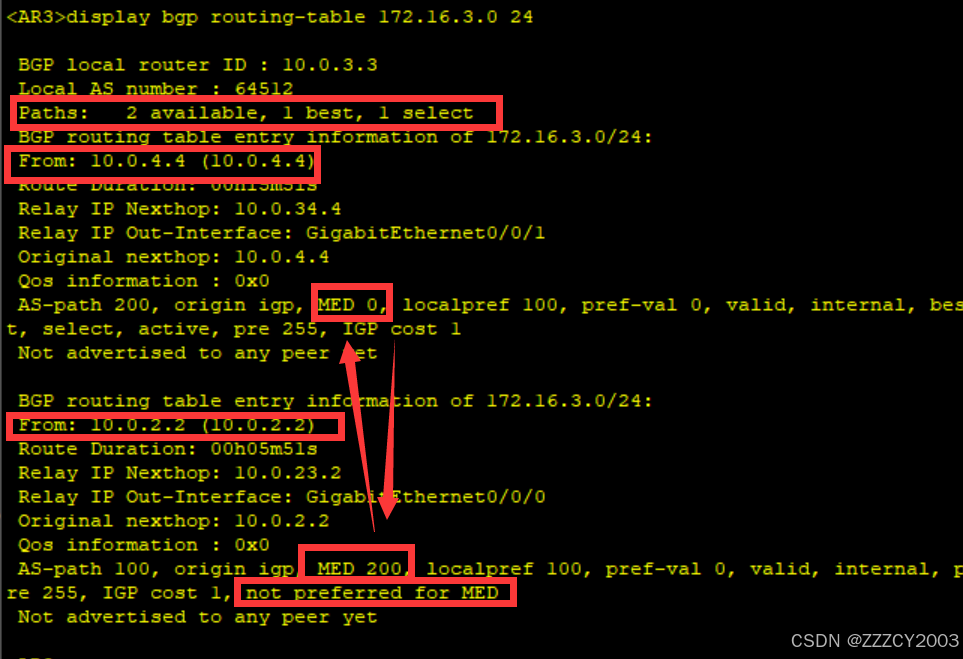 AR2通告的BGP路由172.16.3.0/24其MED值为200,而AR4通告BGP路由MED值为0,AR3优选MED值较小的BGP路由,因此AR2通告的BGP路由未被优选