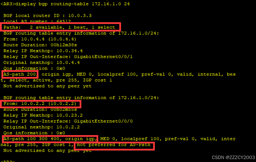 此时AR3优选AR4通告的BGP路由172.16.1.0/24,AR2通告的未被优选的原因是AS_Path长度